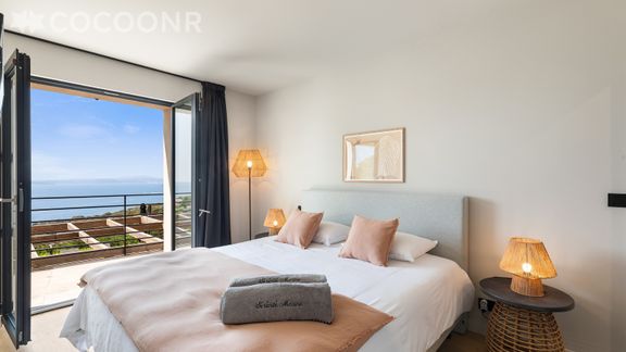- Chambre 4 : un lit king-size (180x200), salle d'eau attenante avec douche et accès terrasse avec vue sur la mer