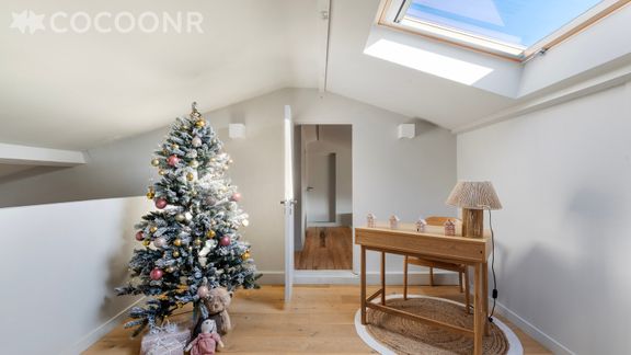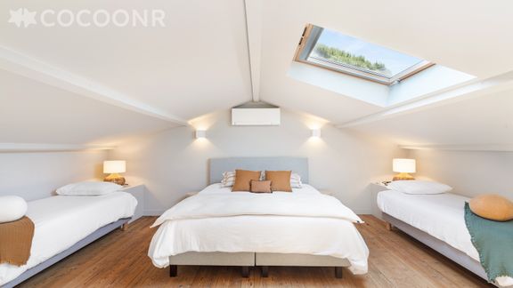 - Chambre 5 : un lit king-size (180x200) et quatre lits simples, pouvant faire office de dortoir pour les enfants. La chambre dispose de deux velux