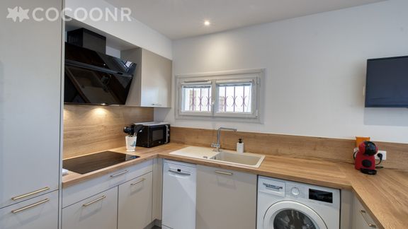 - Une cuisine équipée avec notamment : bouilloire électrique, mini four, four à micro-ondes, grille-pain, lave-vaisselle, plaques de cuisson...