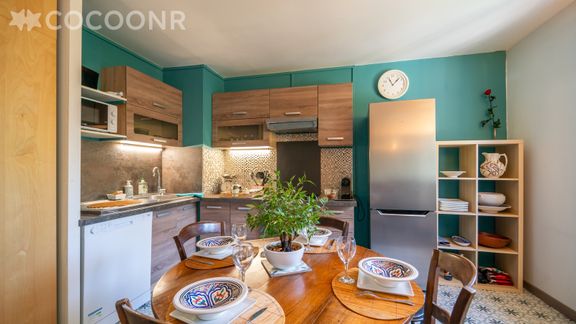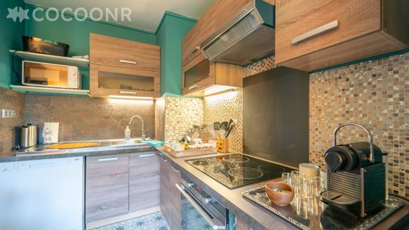 - Une cuisine équipée avec notamment : bouilloire électrique, four, four à micro-ondes, grille-pain, lave-vaisselle, plaques de cuisson...