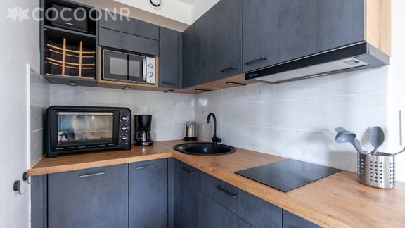 - Une cuisine ouverte équipée avec notamment : bouilloire électrique, four, four à micro-ondes, grille-pain, lave-vaisselle, plaques de cuisson...
