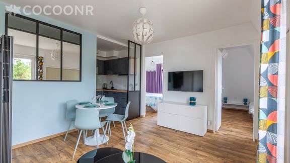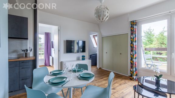 - Une pièce de vie de 15 m² avec TV, Wifi inclus, canapé-lit et espace repas.