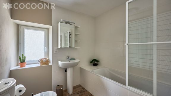 - Une salle de bain avec baignoire, vasque, sèche-serviette et WC