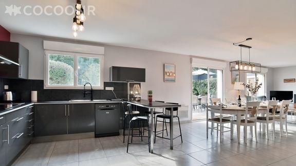 - Une cuisine ouverte sur la pièce de vie, équipée avec notamment : bouilloire électrique, four, four à micro-ondes, grille-pain, lave-vaisselle, plaques de cuisson...