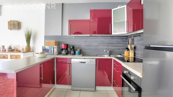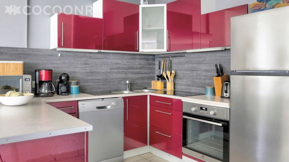 - Une cuisine ouverte équipée avec notamment : bouilloire électrique, four, four à micro-ondes, grille-pain, lave-vaisselle, plaques de cuisson, cafetière à dosettes Senseo...