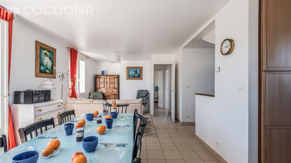 - Une pièce de vie de 16 m² avec canapé, fauteuils et grande table à manger.