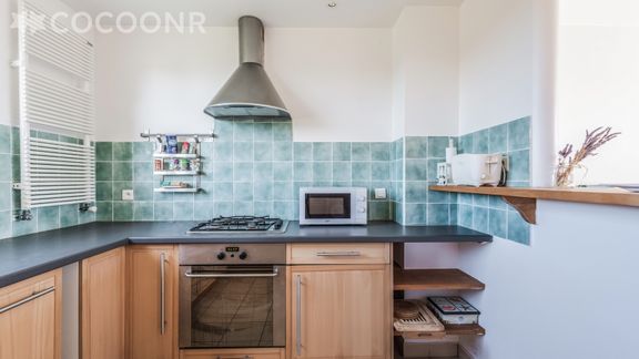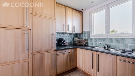 - Une cuisine américaine, ouverte sur le séjour, équipée avec notamment : bouilloire électrique, four, four à micro-ondes, grille-pain, lave-vaisselle, plaques de cuisson...
