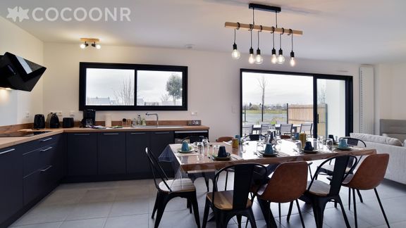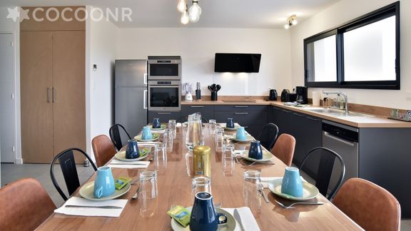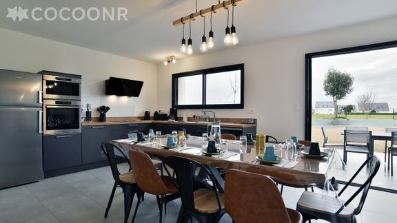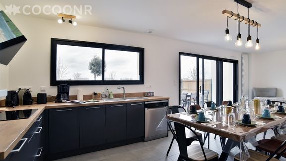 - Une cuisine équipée avec notamment : bouilloire électrique, cafetière filtre et Dolce Gusto, four, four à micro-ondes, grille-pain, lave-vaisselle, plaques de cuisson...