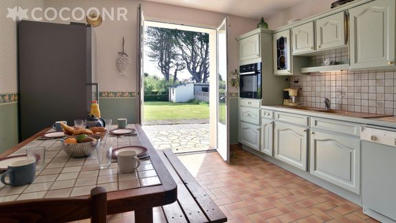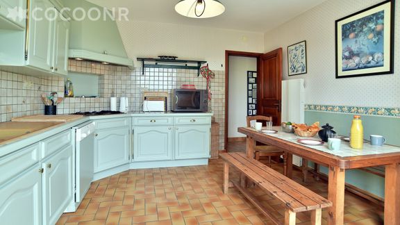 - Une cuisine équipée avec notamment : bouilloire électrique, four, four à micro-ondes, grille-pain, lave-vaisselle, plaques de cuisson ainsi qu'une table à manger