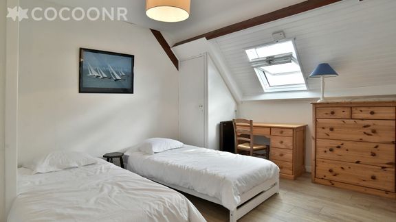 - Chambre 2 : avec 2 lits simples (90×200) pouvant être rapprochés pour former un lit double, un espace bureau et une commode