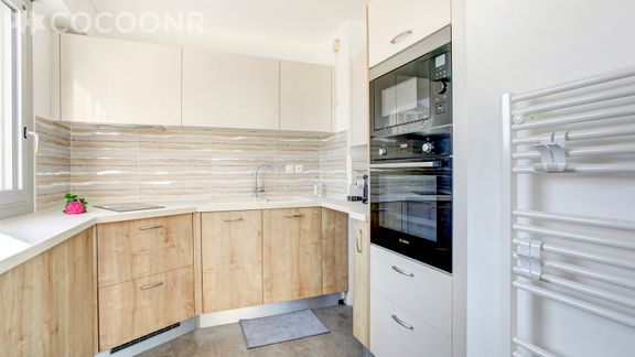 - Une cuisine ouverte équipée avec notamment : bouilloire électrique, four, four à micro-ondes, grille-pain, lave-vaisselle, plaques de cuisson...