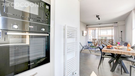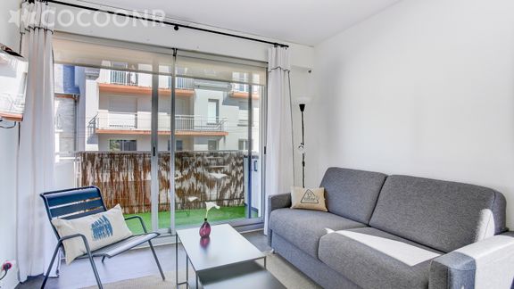 - Une pièce de vie de 18 m² avec un canapé-lit double, fauteuil, espace repas, TV, accès balcon