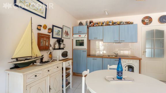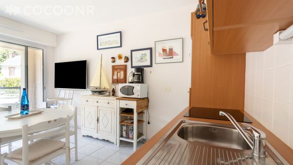 - Une cuisine ouverte équipée avec notamment : bouilloire électrique, four, four à micro-ondes, grille-pain, lave-vaisselle, plaques de cuisson, machine à café à filtre...