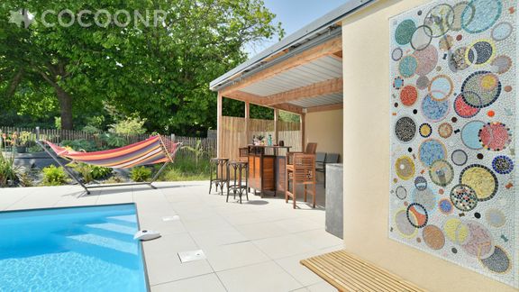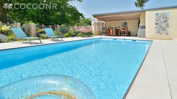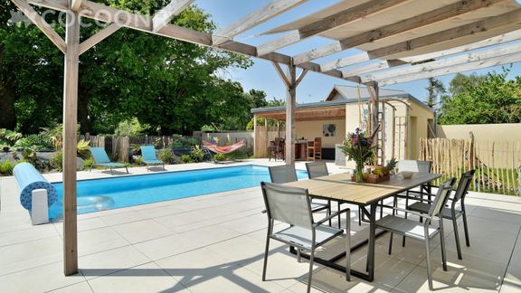- Un beau jardin de 700 m² avec un parking côté nord-est et une grande terrasse exposée sud-ouest entourant la piscine, avec coin repas pour 8 personnes sous une pergola, bar et chaise haute à côté de la piscine et chaises longues pour profiter des beaux jours.