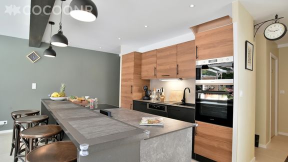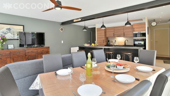 - Une cuisine, ouverte sur le séjour, équipée avec notamment : bouilloire électrique, four, four à micro-ondes, grille-pain, lave-vaisselle, plaques de cuisson, armoires à vin, machine à café dolce gusto...