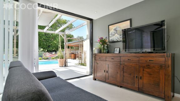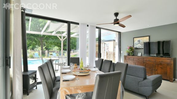- Une pièce de vie lumineuse de 35 m² avec TV, canapé et coin salle à manger, ouverte sur la terrasse