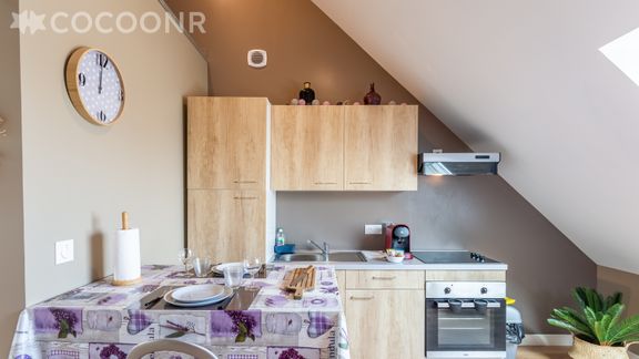 - Une cuisine ouverte équipée avec notamment : bouilloire électrique, four, four à micro-ondes, grille-pain, plaques de cuisson, cafetière à dosettes Nespresso...