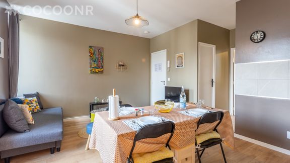 - Une pièce de vie de 19 m² avec TV, canapé convertible (double) et espace repas.