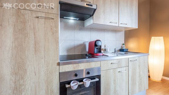 - Une cuisine ouverte équipée avec notamment : bouilloire électrique, four, four à micro-ondes, grille-pain, plaques de cuisson, cafetière à dosettes Nespresso...