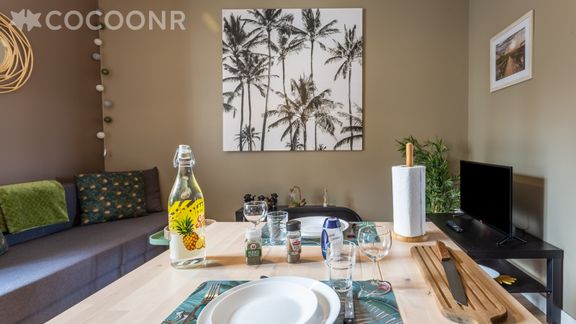 - Une pièce de vie de 16 m² avec TV, canapé convertible (double) et espace repas