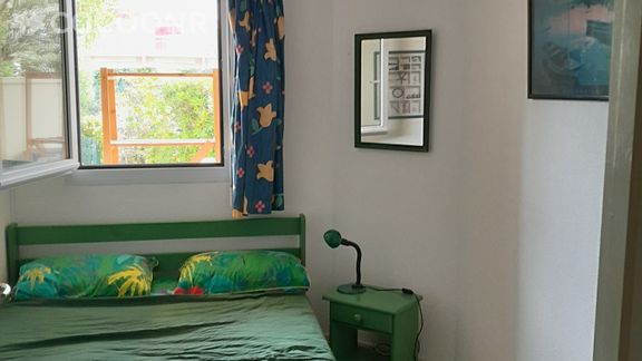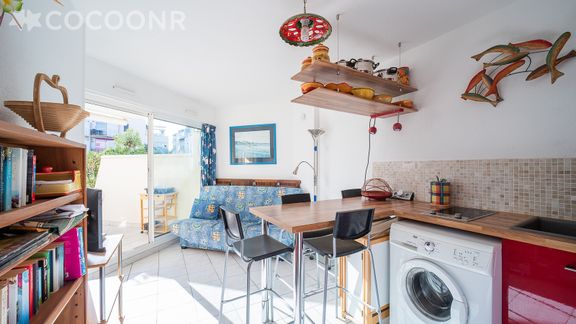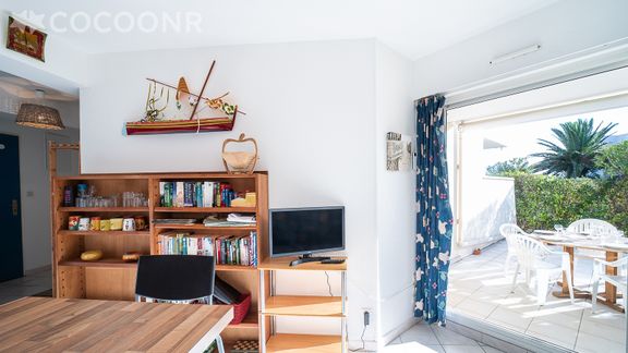 - Une pièce de vie de 13 m² avec TV, canapé, cuisine ouverte équipée avec comptoir de petit-déjeuner et accès direct à une grande terrasse donnant sur le jardin commun.