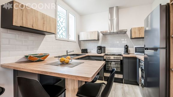 - Une cuisine ouverte équipée avec notamment : bouilloire électrique, four, four à micro-ondes, grille-pain, lave-vaisselle, plaques de cuisson...