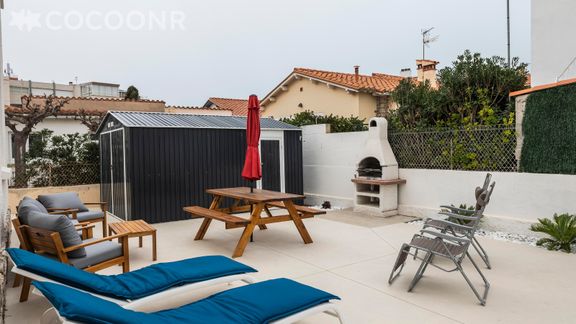 - Une seconde terrasse à l'arrière de la villa d'environ 50 m², ensoleillée dès le matin. Vous disposerez de mobilier de jardin pour profiter des deux terrasses, et d'un store banne pour vous protéger du soleil (dimensions 5mx3,5m)