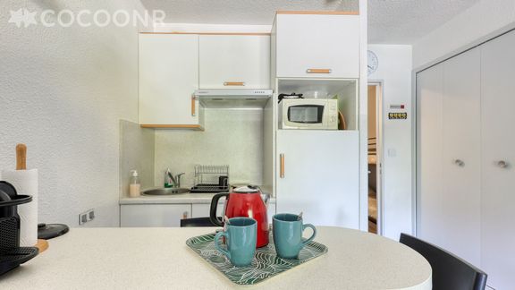 - Une kitchenette équipée avec notamment : bouilloire électrique, four, four à micro-ondes, grille-pain, plaques de cuisson...