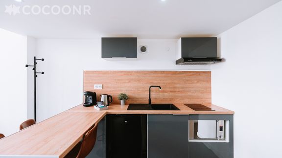 - Une kitchenette équipée avec notamment : machine à café à dosette , bouilloire électrique, four/four à micro-ondes, plaques de cuisson...
