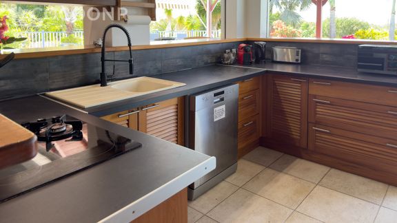 - Une pièce de vie de 70 m² avec TV, canapés et une cuisine ouverte équipée avec notamment : bouilloire électrique, four, four à micro-ondes, frigidaire américain, grille-pain, lave-vaisselle, plaques de cuisson...