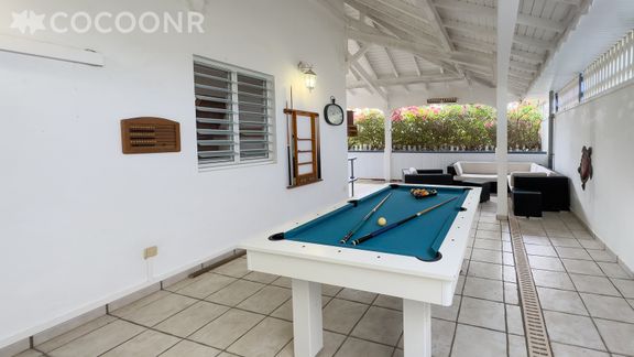 - Une terrasse de 20 m² couverte avec un coin salon avec canapés et un billard