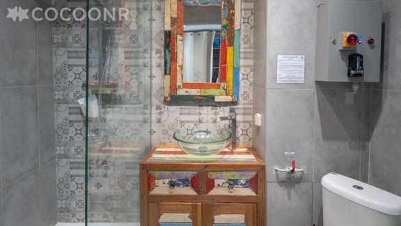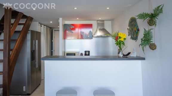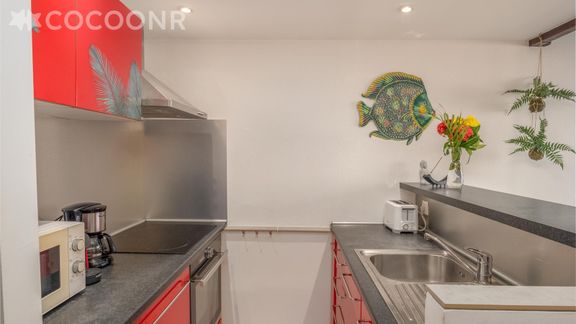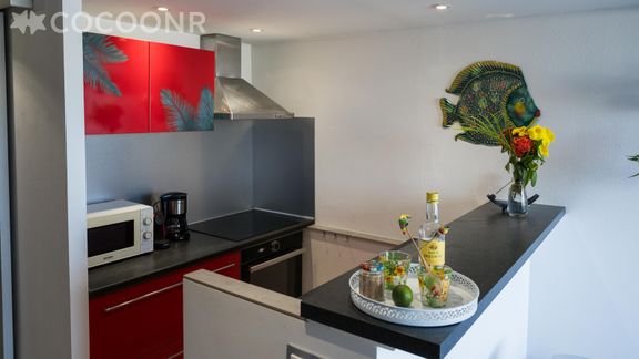 - Une cuisine équipée avec notamment : bouilloire électrique, four, four à micro-ondes, grille-pain, plaques de cuisson...