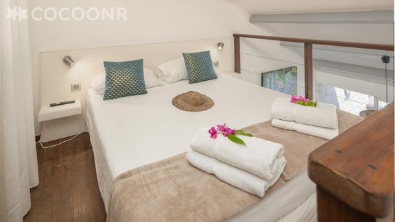 - Une chambre en mezzanine avec un lit queen-size (160×200)