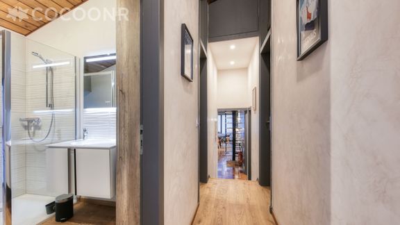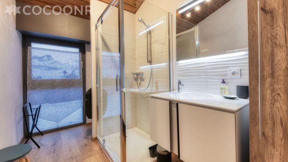 - Une salle d'eau avec douche, un vasque et la buanderie avec lave linge et sèche linge