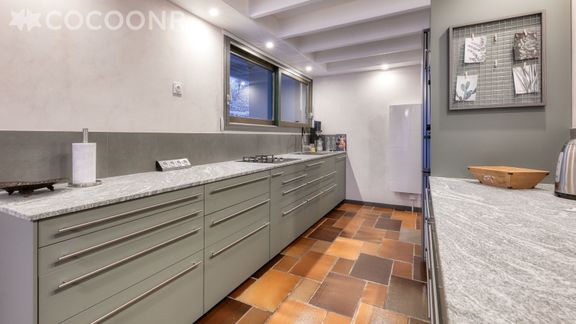 - Une cuisine équipée avec notamment : bouilloire électrique, four, four à micro-ondes, grille-pain, lave-vaisselle, plaques de cuisson...