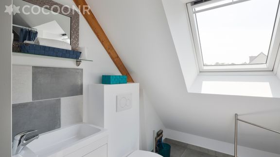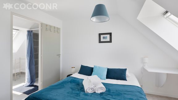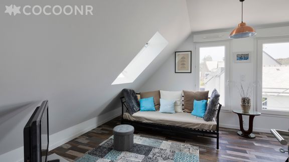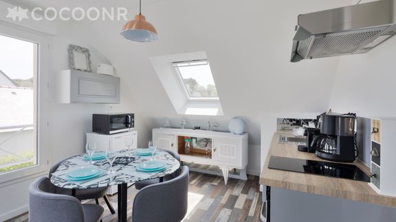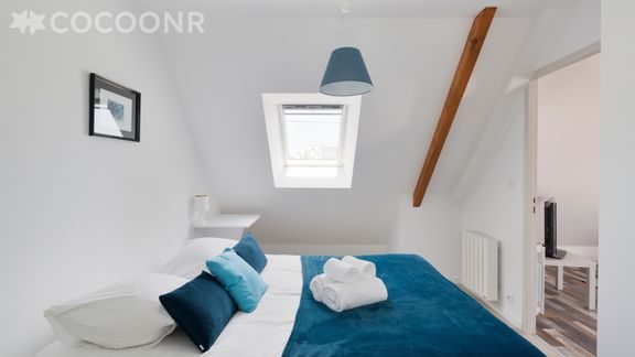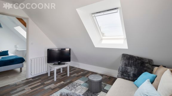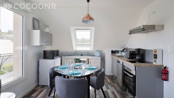 L'agence Cocoonr/Book&Pay vous propose à la location, ce joli appartement de 30 m² entièrement rénové pouvant accueillir deux voyageurs. Situé au premier et dernier étage (sans ascenceur) d'une maison dans un quartier résidentiel, l'appartement se trouve à seulement 300 mètres de la plage De Longchamp à Saint Lunaire. Il comprend un salon avec cuisine ouverte, une chambre séparée avec lit double 160 x 200, une salle de bain avec douche et des WC séparés. Draps et serviettes en supplément.