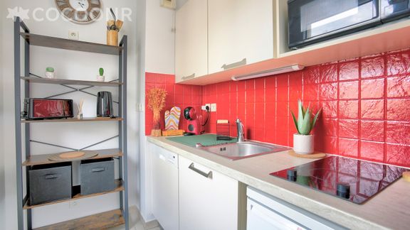 - Une cuisine équipée avec notamment : bouilloire électrique, four à micro-ondes, grille-pain, lave-vaisselle, plaques de cuisson...