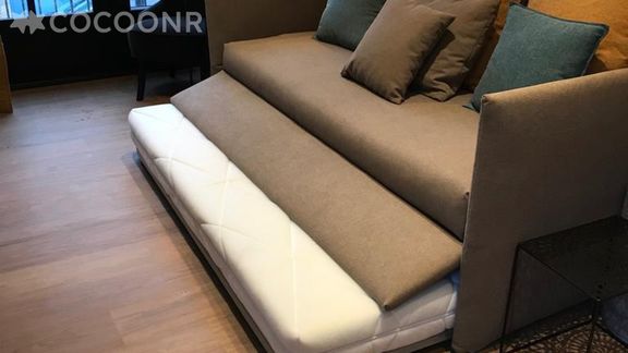 - Une pièce de vie avec table et chaises, canapé-lit, lit double escamotable, TV