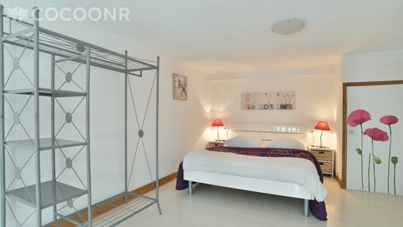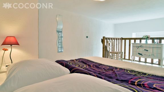 - Une chambre en mezzanine (hauteur sous plafond : 1,85m) avec 1 lit double (140×190), commode et penderie