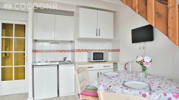 - Une kitchenette, ouverte sur le séjour, équipée avec notamment : bouilloire électrique, four à micro-ondes, grille-pain, plaques de cuisson...