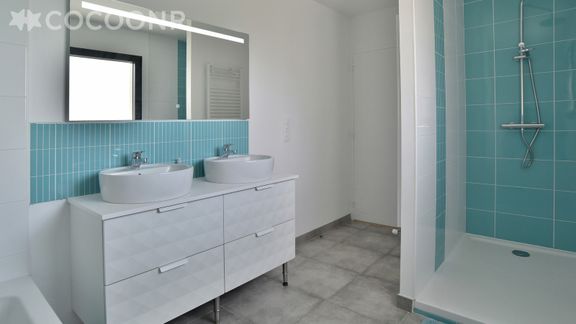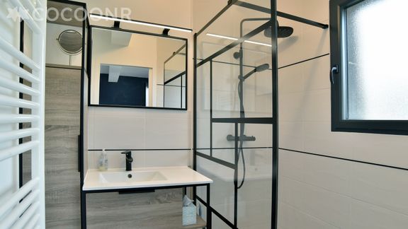 - Une salle de bain avec douche et baignoire
