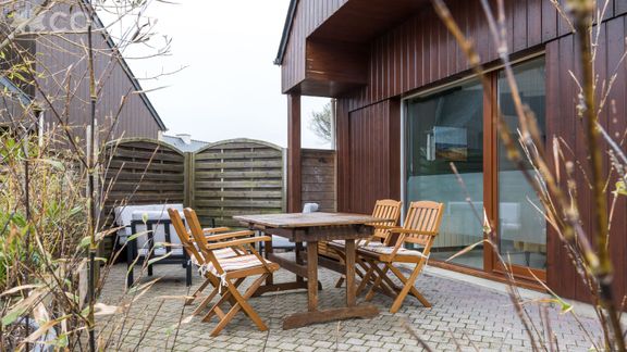 - Terrasse privative de 34 m2 exposée nord-ouest, face à la piscine, table en bois avec rallonges et 8 fauteuils en bois d'extérieur, un salon de jardin aluminium et coussins gris (deux fauteuils et un canapé deux places), un coffre de jardin en bois (stockage des coussins).
