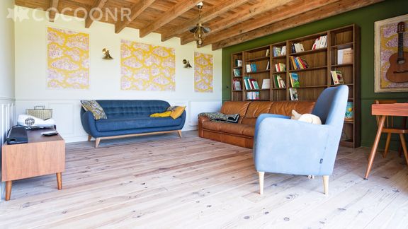- En enfilade, un second salon-bibliothèque s’ouvre partiellement, avec piano, guitare et de nombreux livres à disposition