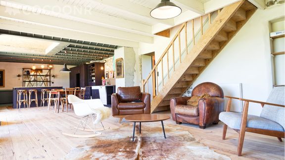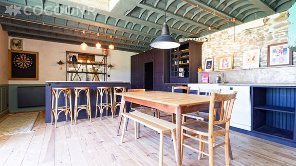 - Une grande pièce de vie d’environ 50 m² comprenant une cuisine ouverte, un coin repas et un salon chaleureux avec cheminée