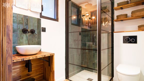 - Une cuisine équipée avec notamment : bouilloire électrique, four, four à micro-ondes, grille-pain, lave-vaisselle, plaques de cuisson...