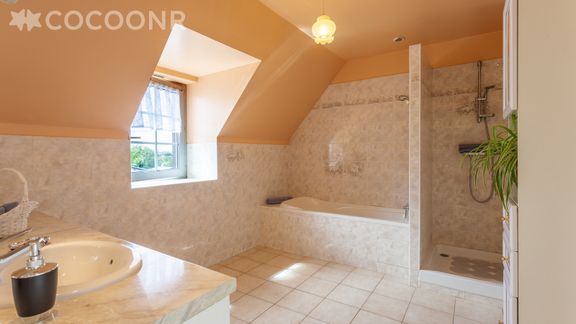 - Une salle de bain avec douche et baignoire