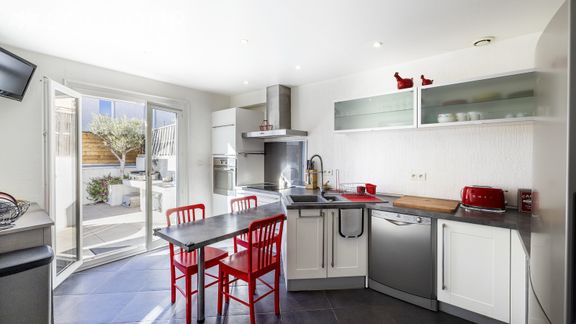 - Un jardin clôturé de 50m² avec terrasse, cuisine d'été (lavabo + plancha), mobilier de jardin.