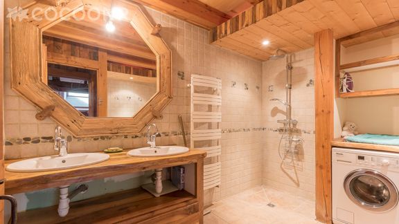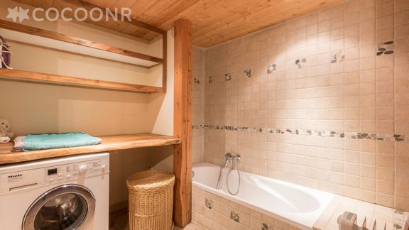 - Une salle de bain avec une douche, une baignoire et un lave-linge