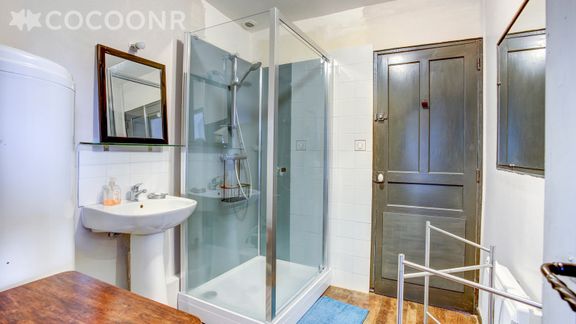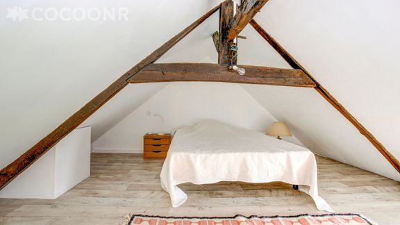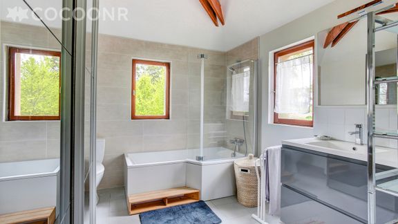 - Chambre 1 : avec un lit double (140×190) et sa salle de bain privative avec baignoire et WC