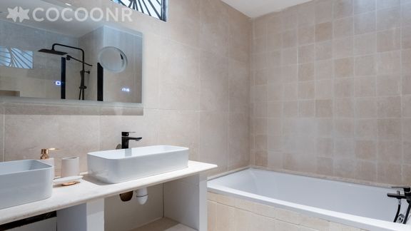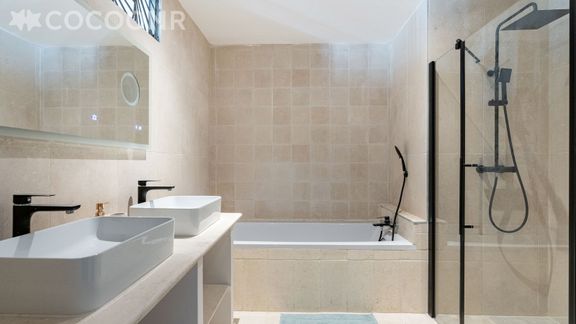 - Chambre parentale : un lit king-size (180×200) donnant sur une terrasse de 13m² avec une salle de bain (douche et baignoire) et WC privatifs.